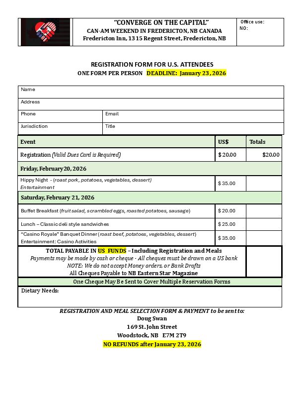 The Officers and Members of Devon Chapter # 37 and St Stephen Chapter # 8, would like to invite you to the Maine in New Brunswick Grand Family Exchange
