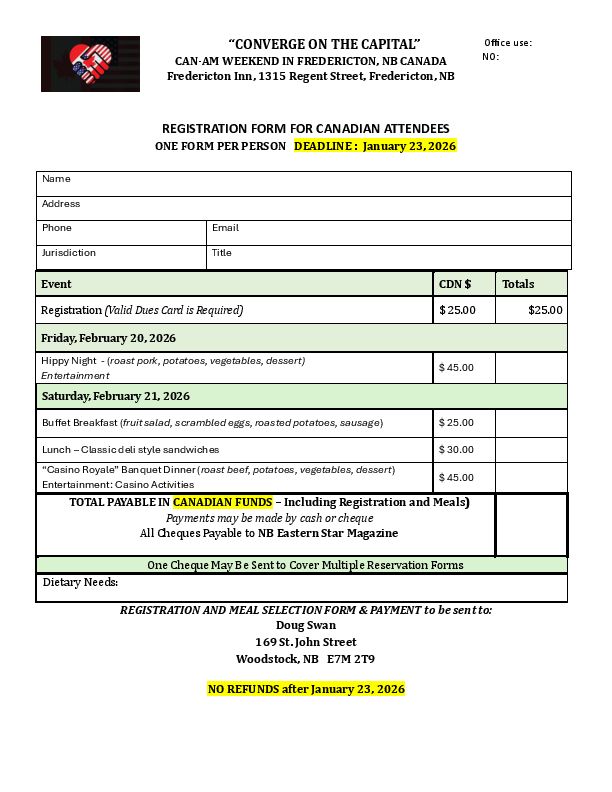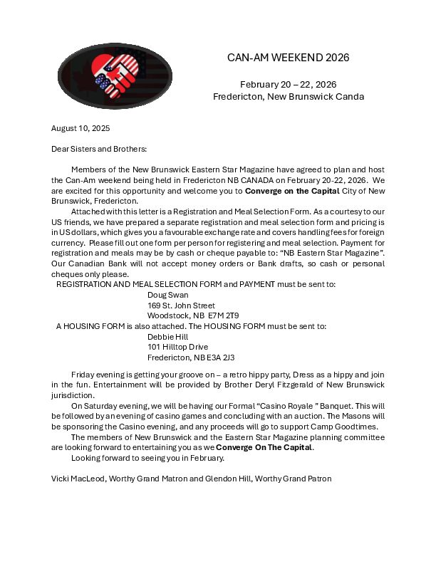 The Officers and Members of Devon Chapter # 37 and St Stephen Chapter # 8, would like to invite you to the Maine in New Brunswick Grand Family Exchange